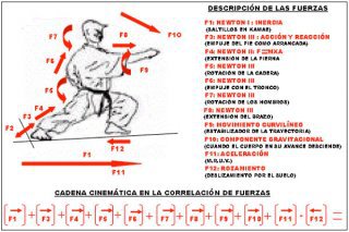 Desde el kamae, la primera acción consiste en un vigoroso empuje con la pierna atrasada contra el suelo, muy similar a la arrancada de los corredores de velocidad o los saltadores. Una vez más estamos haciendo alusión a Newton (tercera ley -de acción y reacción-) que expresa: “Los cuerpos actúan uno sobre el otro con fuerzas de igual módulo y dirección, pero en sentido opuesto”: Siendo así, mientras más activo sea el empuje de la pierna contra el piso hacia atrás con los músculos Gemelos y otros planos musculares, mayor será la aceleración hacia delante. Esta puede asumirse como la segunda fuerza a favor de nuestro movimiento.