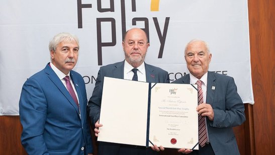 The World Fair Play Trophy is awarded by the International Fair Play Committee to personalities who have proved to be excellent ambassadors of fair play. The award recognises acts of fair play, general attitude of sportsmanship throughout a sports career, and activities aiming to promote these values in sport. In his nearly 20 years as head of the WKF, Mr. Espinós has taken the sport to new levels and has contributed to raising the profile of the ancient modality.