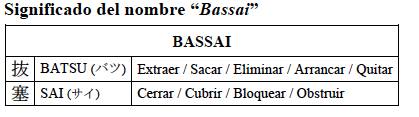 El significado de “Bassai” (抜塞) comúnmente aceptado es “Asalto a la Fortaleza” (Baeza ) o “Penetrar la Fortaleza” (Schlatt ).