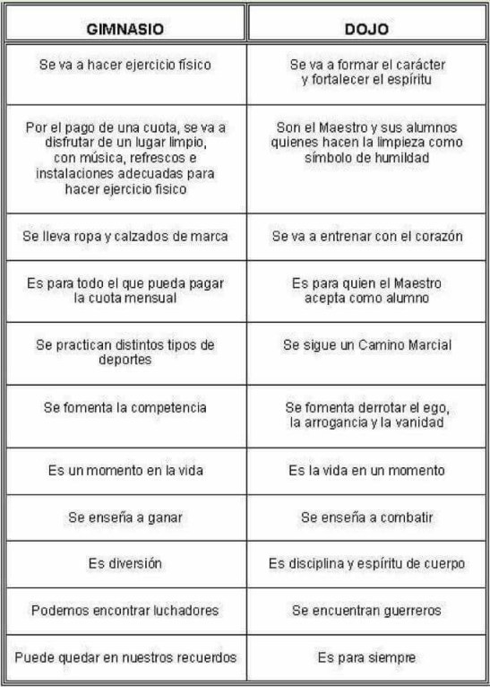 Sin embargo, cuando una persona dice: –voy al “gimnasio” generalmente implica actividades o actitudes lúdicas, recreativas o hedonistas y en el mejor de los casos buscan una mejora de la salud o de la forma física. Por tanto, una vez reflexionado sobre estos dos términos <gimnasio-dôjô>, el estudiante de Karate-dô u otro arte puede preguntarse por cual de ellos decantarse. Para un “budo-ka” o artista marcial la elección será clara, pues, cualquier beneficio realmente enriquecedor que pueda obtenerse mediante las actividades de “gimnasio”, puede ser obtenido con creces a través de la práctica de un arte como el Karate-dô. No obstante, el camino a la inversa no es posible, ya que, cualquier arte del Budô, aporta beneficios y entra en campos en los cuales el deporte no tiene cabida…