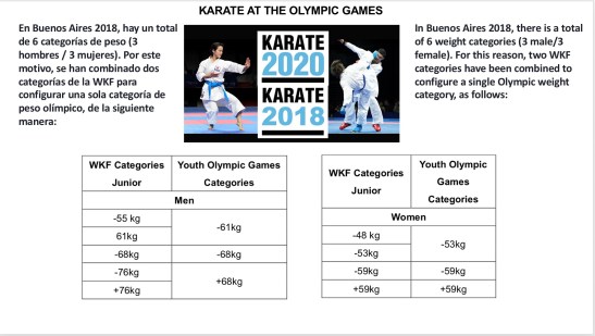 En Buenos Aires 2018, hay un total de 6 categorías de peso (3 hombres / 3 mujeres). Por este motivo, se han combinado dos categorías de la WKF para configurar una sola categoría de peso olímpico, de la siguiente manera: