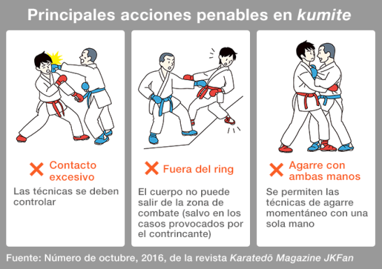 En los torneos, los contrincantes se diferencian llevando colores distintos -rojo y azul-, tanto en el caso del kumite como en el de la kata.