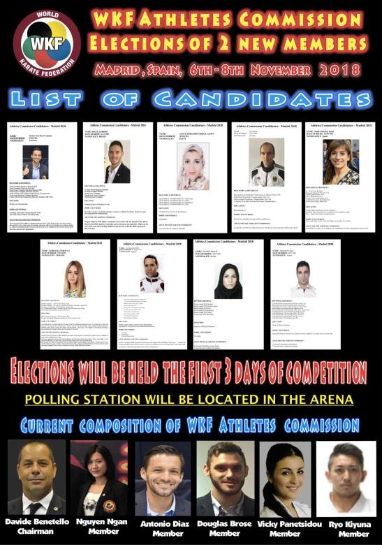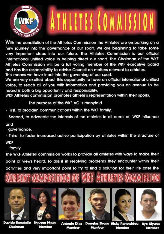 And More….At the occasion of the upcoming World Senior Championships that will take place from 6th to 11th November in Madrid, the Chairmen from the WKF Athletes’ Entourage Commission and the WKF Athletes’ Commission would like to invite one athletes’ representative from every National Federation to attend a meeting on Sunday 4th November at 19.00h at the Room La Paz in the HQ Hotel Novotel Madrid Center.