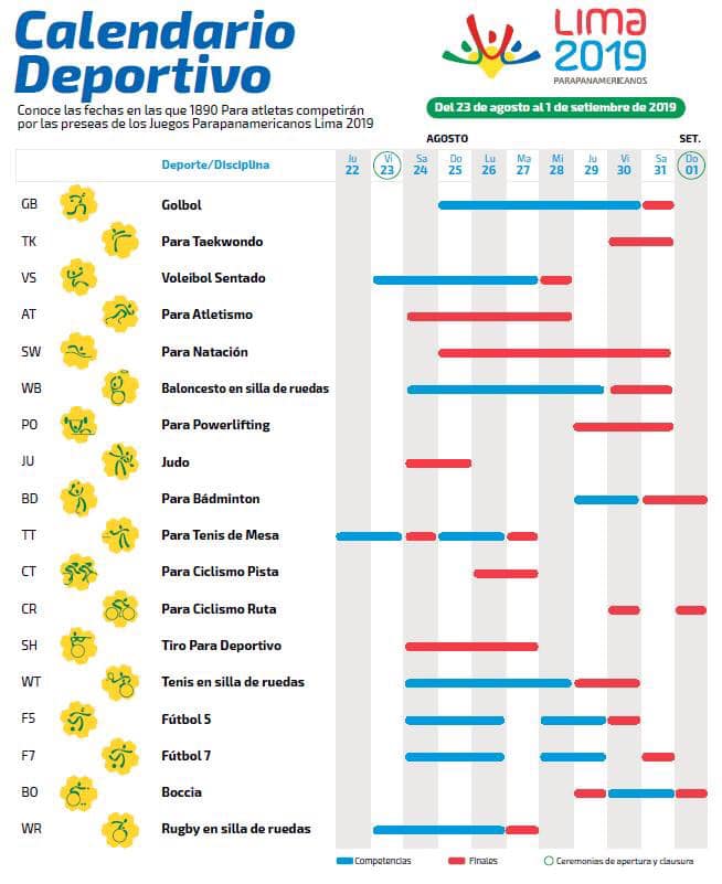 En tanto, los Juegos Parapanamericanos, albergarán a 1,890 Para atletas de 33 países, que participarán en 17 deportes y 18 disciplinas. Las competencias se realizarán entre el 23 de agosto y el 1 de setiembre de 2019. 14 deportes entregarán cupos a los Juegos Paralímpicos Tokio 2020.