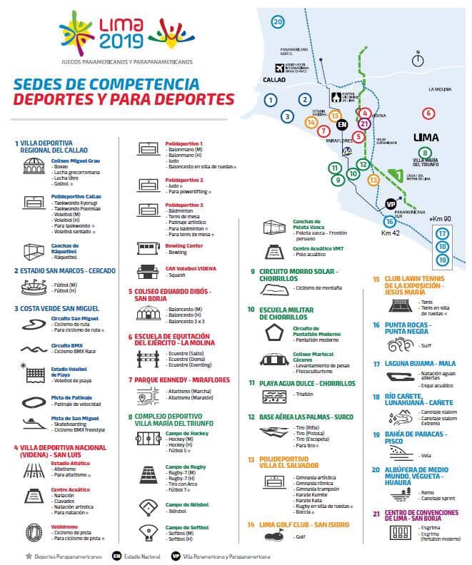 Serán en total 17 días de competencias y ceremonias, entre el 26 de julio y el 11 de agosto, que se desarrollarán en 14 distritos de Lima y Callao en distintas sedes como la VIDENA, Complejo Deportivo Villa María del Triunfo, Villa Deportiva Regional del Callao, Polideportivo Villa El Salvador, Punta Rocas, entre otras.
