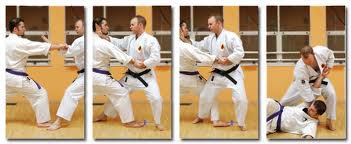 En el trabajo en cuestión se pueden apreciar tras la defensa correspondiente, una técnica de luxación, derribo, proyección o estrangulación para finalizar al contrincante. Obsérvese que dicha propuesta está realizada en modo semi estático (Go), es decir, es un trabajo básico para practicar tanto defensas y posiciones básicas de Karate como luxaciones de Goshin, etc. Con esto quiero subrayar que la aplicación real sería realizada en posiciones naturales, con ataques en Kebanashi(percutantes y/o con recogida del brazo), y con movimientos más dinámicos y libres que la ortodoxia que implica el Kihon.