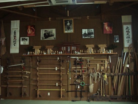 Foto del o los maestros: En una amplía mayoría de dojos en Japón, se colocan las fotos de los maestros ya fallecidos, a la izquierda del Shinden y a la derecha se colocan las de los actuales o los que aún viven.