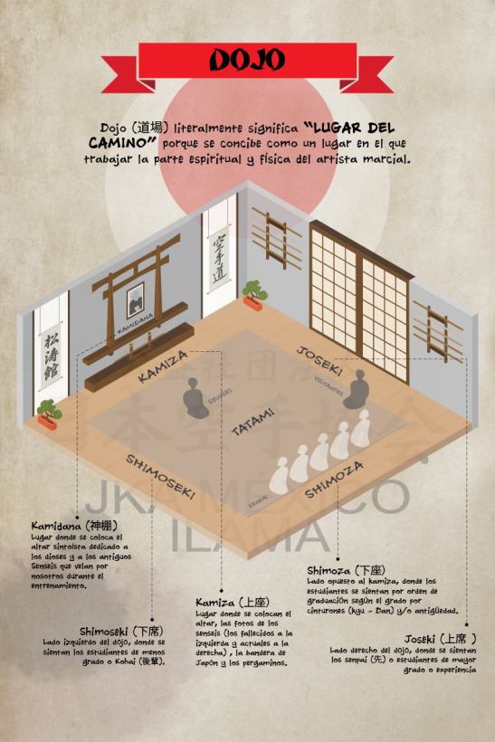 Dojo (道場) literalmente significa “LUGAR DEL CAMINO” porque se concibe como un lugar en el que trabajar la parte espiritual y física del artista marcial. Esta formado por cinco partes principales: