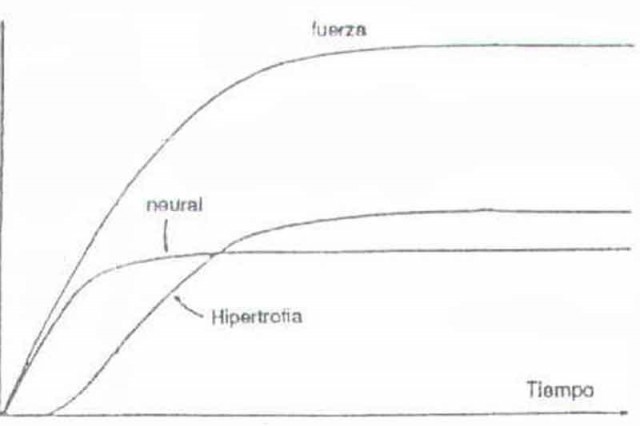 Las mejoras de fuerzas iniciales son debidas a una adaptación neural (verde) por activación de las unidades motrices, la innervación nerviosa a nivel muscular es mayor, en cada contracción se pueden activar un número mayor de fibras.